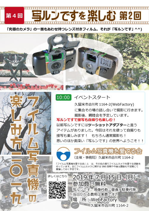 当日は写ルンですを使った撮影会のほか、フイルムカメラに関する事、簡単な歴史や使い方などもお知らせする予定です。